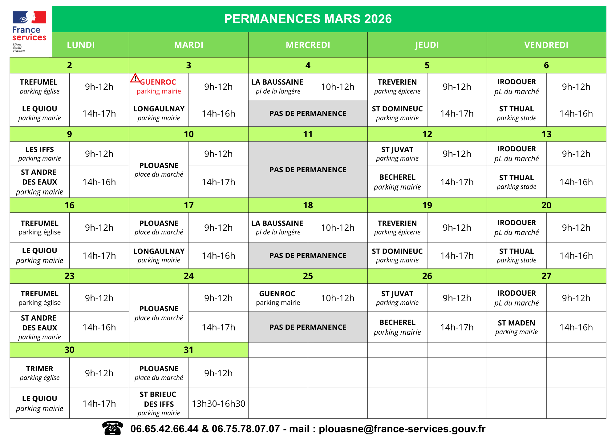 Venue du camping-car : Les services publics viennent à vous COM-JPO-Plouasne Tableau des permanences : 2026 : Permanences Mars 2026 Permanences Février 2026 Permanences janvier 2026 2025 : Permanences décembre 2025 Permanences novembre 2025 Permanences octobre 2025 Permanences septembre 2025 Permanences août 2025 Permanences juillet 2025 Permanences juin 2025 Permanences mai 2025 Permanences avril 2025 Permanences mars 2025 Permanences février 2025 Permanences janvier 2025 2024 : Permanences décembre 2024 Permanences novembre 2024 Permanences octobre 2024 Permanences septembre 2024 Permanences août 2024 Permanences juillet 2024 Permanences juin 2024 Permanences mai 2024 Permanences avril 2024 Permanences mars 2024 Permanences février 2024 Permanences janvier 2024 2023 : Permanences décembre 2023 Permanences novembre 2023 Permanences septembre 2023 Permanences août 2023 Permanences Juillet 2023 Permanences Juin 2023 Permanences Mai 2023 Permanences Avril 2023